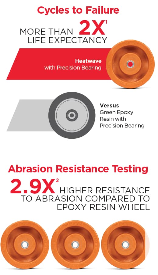 Are you ready to reduce your high-temp caster cost by half? The all-new Heatwave high-temp caster has twice the life expectancy of the leading green epoxy wheel, meaning less frequent replacement and more uptime in your bakery. Plus, with Heatwave’s integrated precision ball bearing, you’ll add ergonomic advantages that make everyone from floor workers to ergonomists happy. Lastly, the Heatwave is made in the United States, meaning your supply chain is further insulated from future tariff uncertainty.
